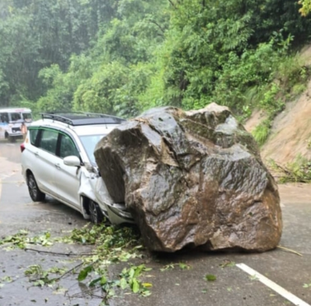 नैनीताल-हल्द्वानी हाईवे पर आमपड़ाव के पास टैक्सी वाहन के बोनट पर गिरा बोल्डर