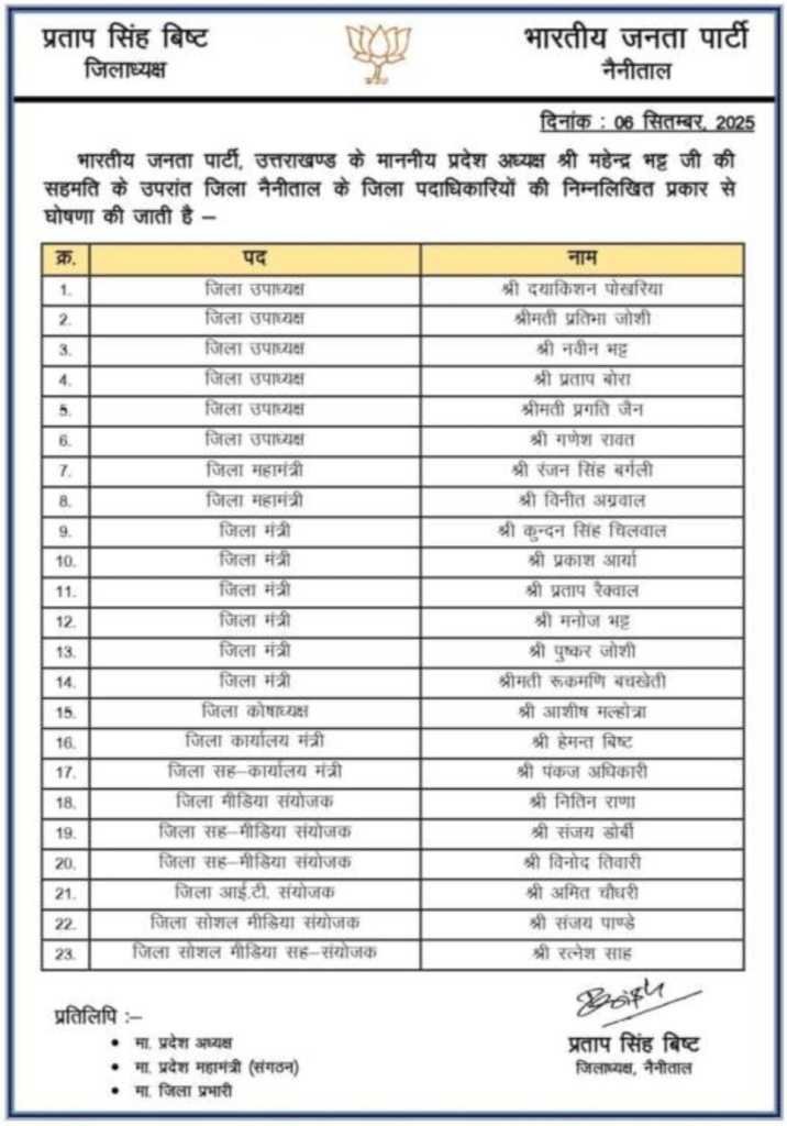 घोषित सूची के अनुसार, जिला नैनीताल में विभिन्न पदों पर निम्नलिखित कार्यकर्ताओं को जिम्मेदारी सौंपी गई है।