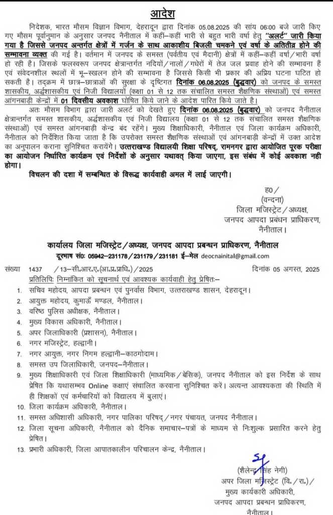 नैनीताल। उत्तराखंड में लगातार हो रही भारी बारिश के चलते बुधवार, 6 अगस्त 2025 को जनपद नैनीताल के समस्त विद्यालयों एवं आंगनबाड़ी केंद्रों में अवकाश घोषित किया गया है।भारत मौसम विज्ञान विभाग द्वारा जिले में भारी से अत्यंत भारी वर्षा की चेतावनी (रेड अलर्ट) जारी की गई है, जिसके दृष्टिगत यह निर्णय लिया गया है