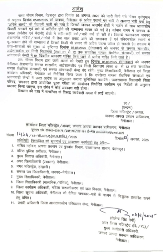 इस सम्बन्ध में जानकारी देते हुए जिलाधिकारी वंदना ने अवगत कराया कि संभावित आपदा जोखिमों जैसे भूस्खलन, सड़क अवरोध, जलभराव, एवं नदी-नालों में तेज बहाव को ध्यान में रखते हुए विद्यार्थियों की सुरक्षा हेतु जनपद नैनीताल में संचालित सभी शासकीय, अशासकीय एवं निजी विद्यालय (कक्षा 1 से 12 तक) एवं समस्त आंगनबाड़ी केंद्रों में दिनांक 5 अगस्त 2025 (मंगलवार) को एक दिवसीय अवकाश रहेगा। उन्होंने संबंधित शैक्षणिक एवं प्रशासनिक अधिकारियों को निर्देशित किया गया है कि वे आवश्यकतानुसार अपने-अपने कार्यालयों में उपस्थित रहें एवं आपदा की स्थिति में समन्वय बनाए रखें। किसी भी प्रकार की आपदा की घटना होने पर आपदा नियंत्रण कक्ष के दूरभाष संख्या 05942-231178 एवं 231179 अथवा टॉल फ्री नंबर 1077 पर सूचित करें।
