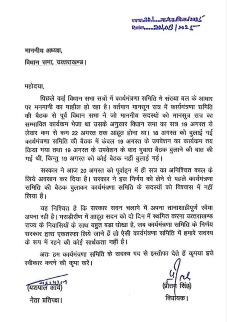 इसके बावजूद 19 अगस्त को कोई बैठक नहीं बुलाई गई। विपक्ष ने आरोप लगाया कि सरकार ने 20 अगस्त की सुबह ही सत्र का अनिश्चितकालीन अवसान कर दिया और इस पर कार्यमंत्रणा समिति के सदस्यों को विश्वास में नहीं लिया गया। विपक्ष ने इसे जनता के साथ धोखा करार देते हुए कहा है कि भराड़ीसैंण में आहूत सदन को मात्र दो दिन में स्थगित करना गंभीर लोकतांत्रिक चिंता का विषय है। इस्तीफ़ा पत्र में स्पष्ट लिखा गया है कि जब सरकार सभी फैसले एकतरफा ले रही है, तो समिति में बने रहने का कोई औचित्य नहीं रह जाता। नेता प्रतिपक्ष यशपाल आर्य ने फेसबुक पोस्ट कर इस्तीफ़े की जानकारी साझा की।