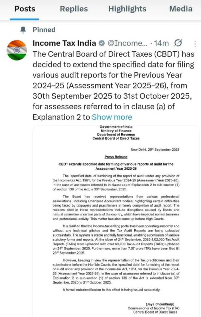 रामनगर। केंद्रीय प्रत्यक्ष कर बोर्ड (सीबीडीटी) ने आयकर ऑडिट रिपोर्ट दाखिल करने की अंतिम तिथि 30 सितम्बर 2025 से बढ़ाकर अब 31 अक्टूबर 2025 कर दी है।